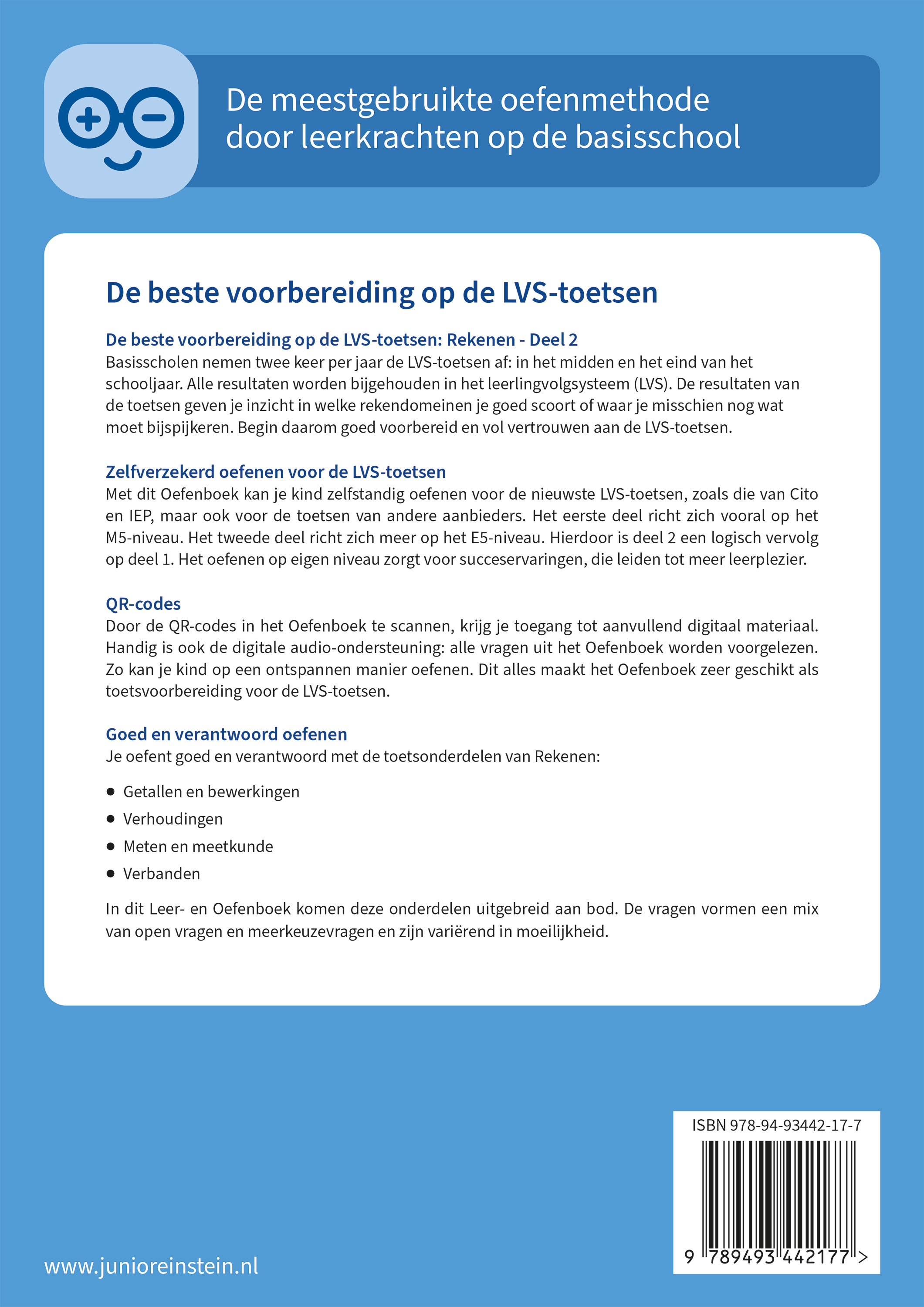 Met de boeken van Junior Einstein bereiden kinderen – met veel succes – zich al meer dan een decennium voor op toetsen. Elk boek is gemaakt door leerkrachten en onderwijsspecialisten onder leiding van Joan Sanders. Al ruim 10 jaar werken ze met passie samen aan het maken van het beste oefenmateriaal voor kinderen op de basisschool, met name voor toetsvoorbereiding. Kinderen, ouders en leerkrachten gebruiken naar alle tevredenheid de oefenmaterialen van Junior Einstein.
